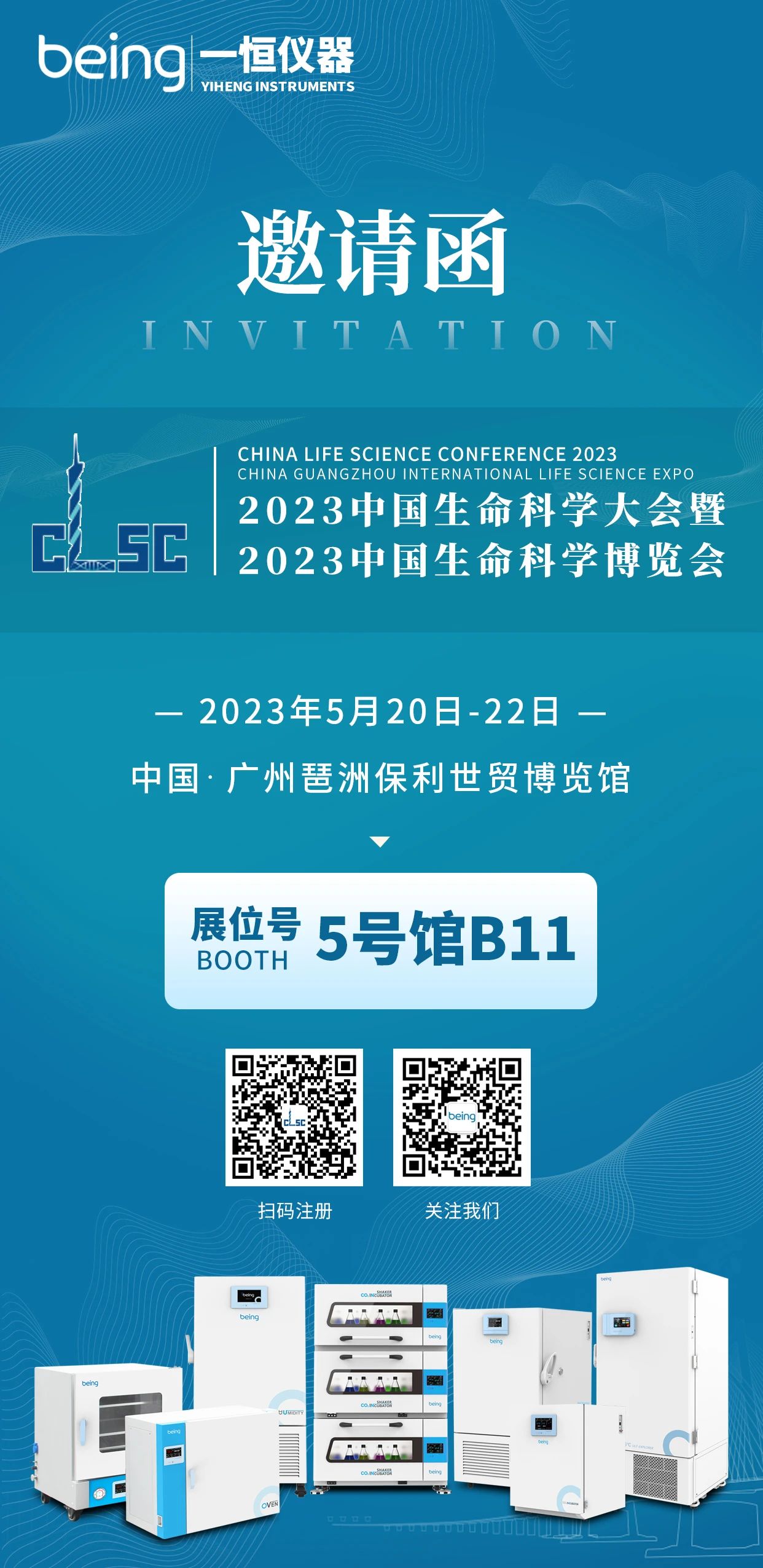 我們誠摯邀請您參加此次展會并歡迎蒞臨我們展位:5號館B11。屆時,我們將現場展示低溫振蕩二氧化碳培養箱、生物安全柜、疊加式振蕩器、液相液氮罐、搖床、磁力攪拌器等產品,期待與您現場交流。