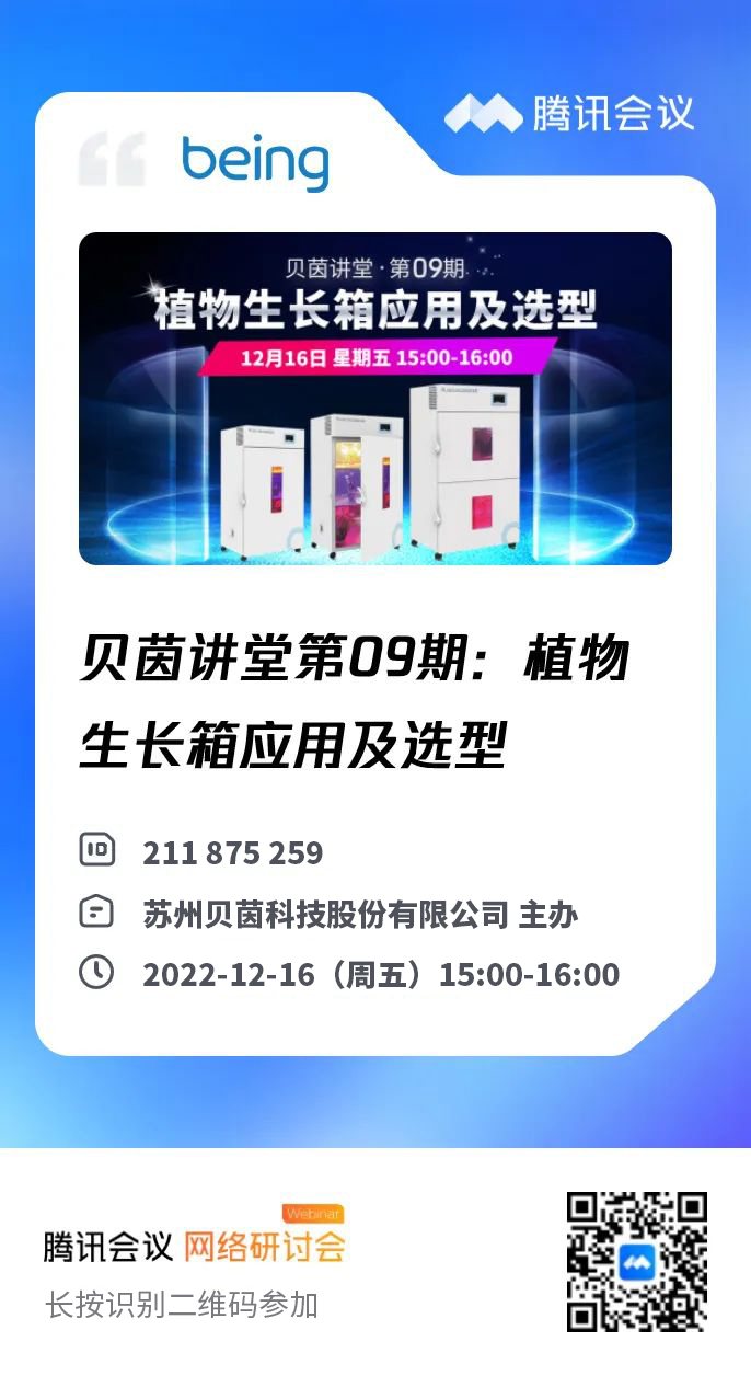 12月16日(周五)下午15:00,我們將與各位小伙伴通過貝茵講堂分享貝茵植物生長(zhǎng)箱系列的應(yīng)用和選型,歡迎您的參與和交流。