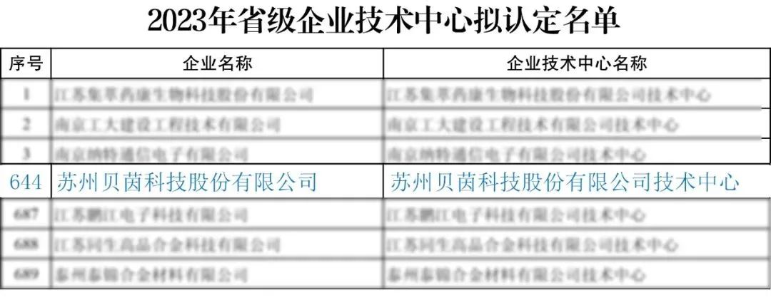 近日,江蘇省2023年省級企業技術中心擬認定名單現已公示結束,蘇州貝茵科技股份有限公司成功入選。
